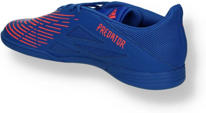 Blauwe Adidas Predator Edge 4 In kinder zaalschoenen. Het buitenwerk is gemaakt van imitatieleer, het binnenwerk van textiel en de stevige non-marking profielzool van rubber. De binnenzool is gemaakt van textiel, deze is niet uitneembaar. De zaalschoenen zijn voorzien van vetersluiting. Op het buitenwerk voorzien van Adidas 3-Stripes en oranje details.