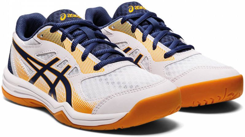 Specificaties: * Pasvorm: standaard breedtemaat; Asics sportschoenen vallen klein, advies om een maat groter te bestellen * Model: laag * Demping: Gel-Cushioning in de zool; EVA binnenzool * Tussenzool: Gel-Cushioning * Binnenzool: EVA * Buitenzool: rubber * Bovenwerk: mesh met synthetisch leer * Kleur: wit navy oranje * Materiaal: synthetisch materiaal textiel rubber.