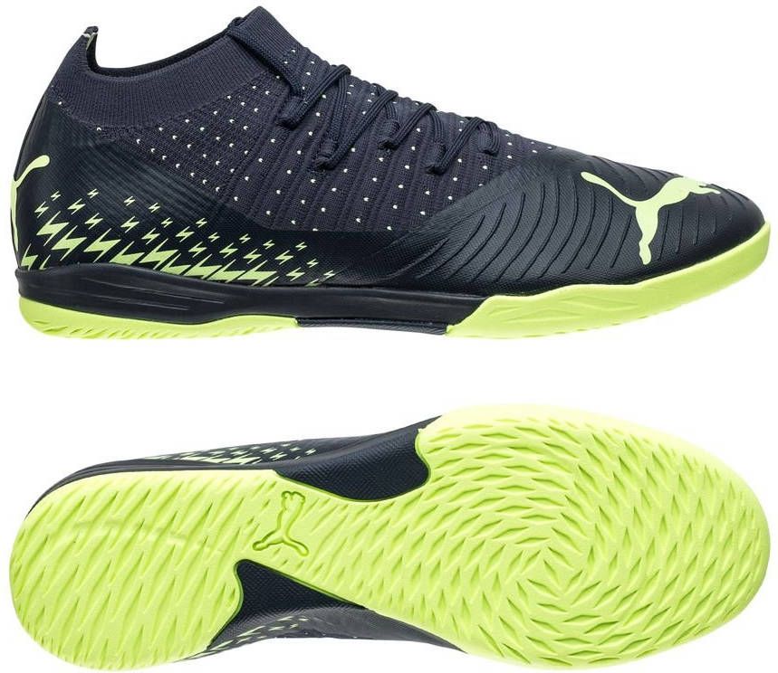 4 IT Zaalvoetbalschoenen HerenSpecificaties: * Pasvorm: nauwsluitend, vormt zich naar de voet; slip-on sok zorgt voor een sokachtig gevoel bij de instap; FuzionFit+ is een compressieband die zich aan de vorm van de voet aanpast * Bovenwerk: Puma Creator technologie biedt een betere balcontrole, kracht en precisie * Zooltype: rubberen zool die veel grip geeft in de zaal maar niet afgeeft; Dynamic Motion System biedt veel ondersteuning bij explosieve verandering van richting * Kleur: donker blauw lime groen * Materiaal: synthetisch materiaal textiel rubber.